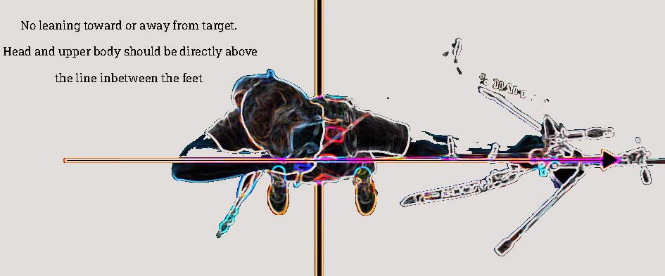 The lower body has this angle because of the slight ‘lean’ onto the balls of the feet. However the upper body position is to ensure your bow is held at a straight/90 degree angle. Your upper body aligns with the bow.
