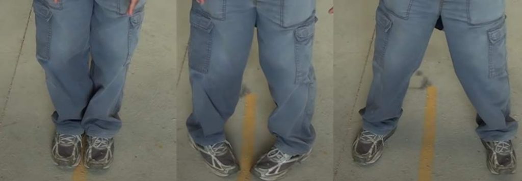 - Legs straight without knees being flat, with body 60% body weight on balls of your feet. Slightly rotate your toes outward a few degrees only to create the feeling of rotating your toes outward & into the ground, to activate your bum muscles