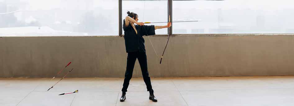 In all stances, both feet should be roughly shoulder-width apart and an even distance from each other. If you’re struggling to know where shoulder-width is exactly, then it’s better to be slightly wider than narrower. The key is to feel the weight of your body flowing to the floor and giving yourself stability. If your stance is too narrow, or too wide, you will feel unstable when you pull the bow.